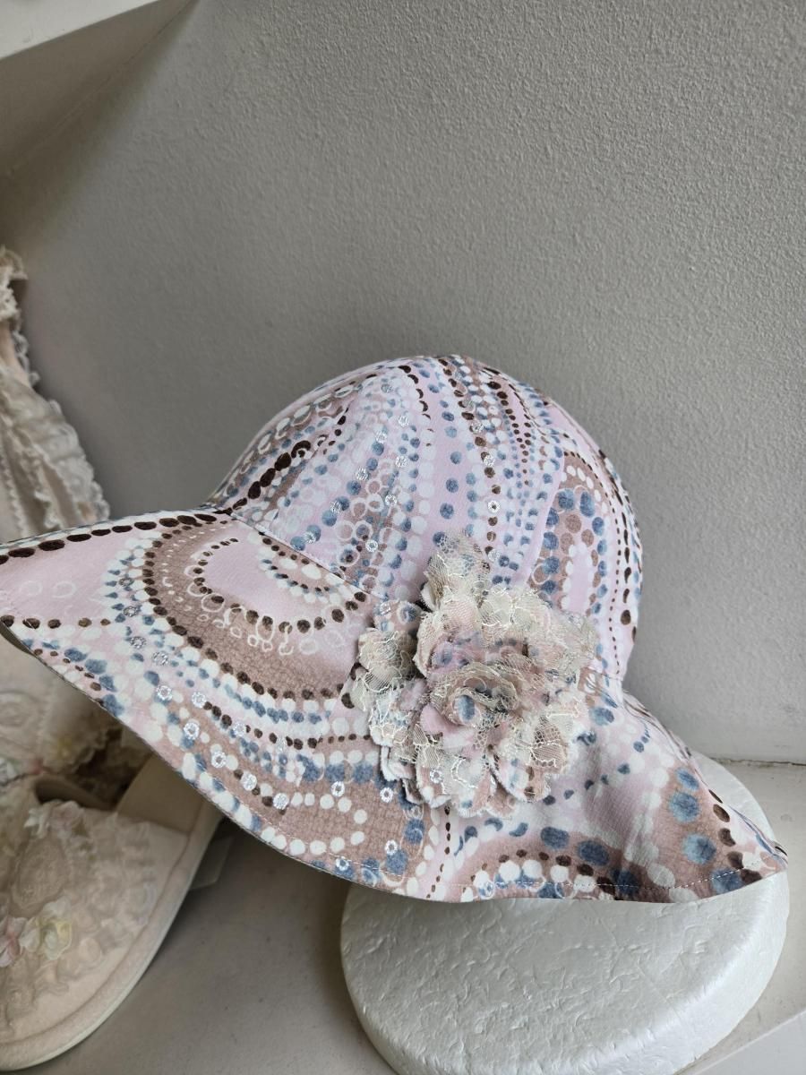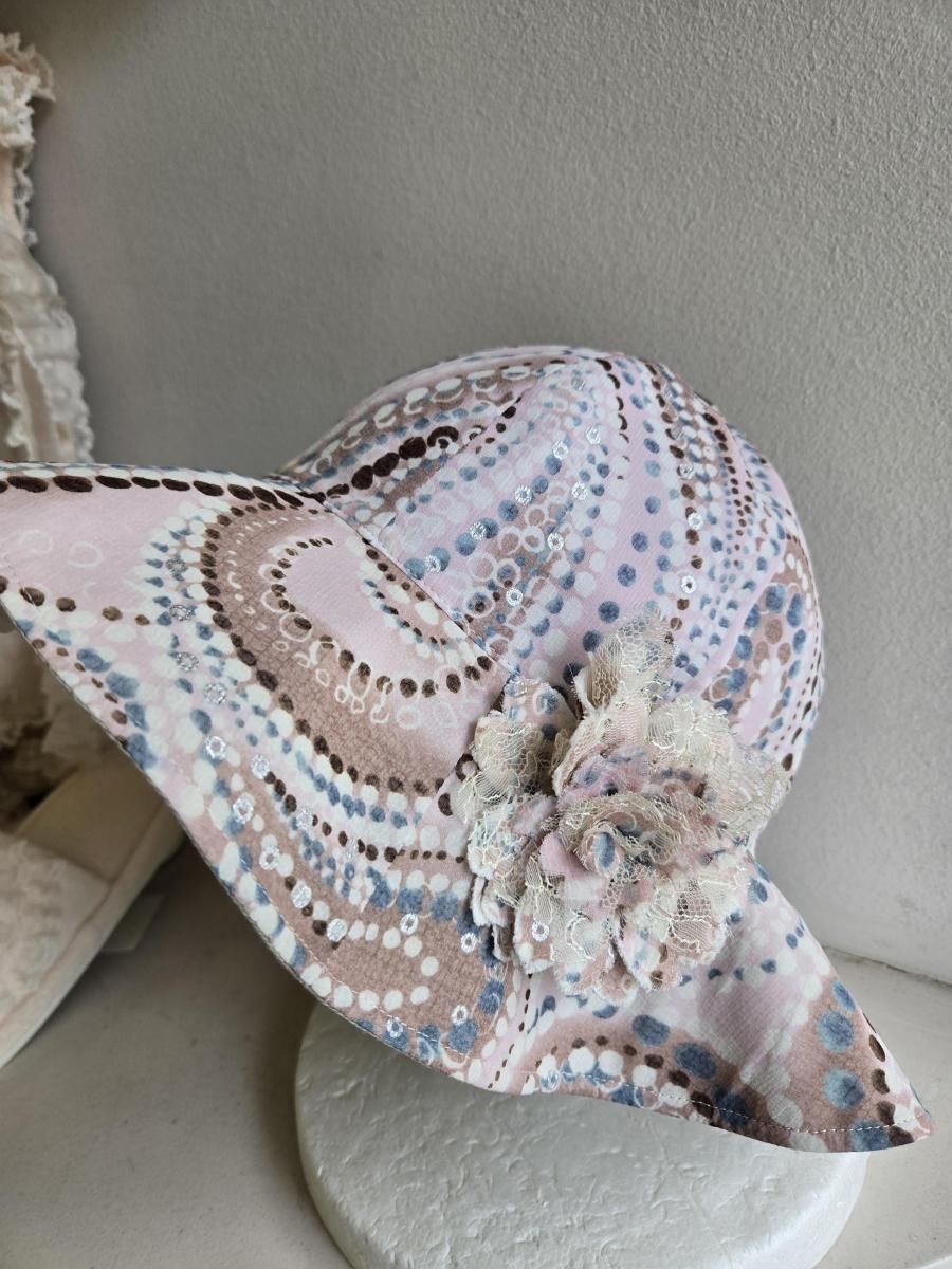 無地ベージュとピンク系プリントのコンビネーションのリバーシブル帽子。
