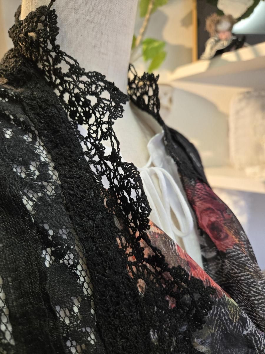 柔らかで伸縮たっぷりな・花柄レース反使いの羽織物シュラッグ。