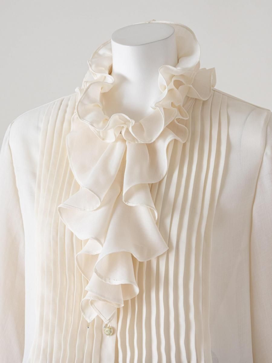 ラッフルフリルが胸元に華やぎを与え、おしゃれ度もUPですよ。